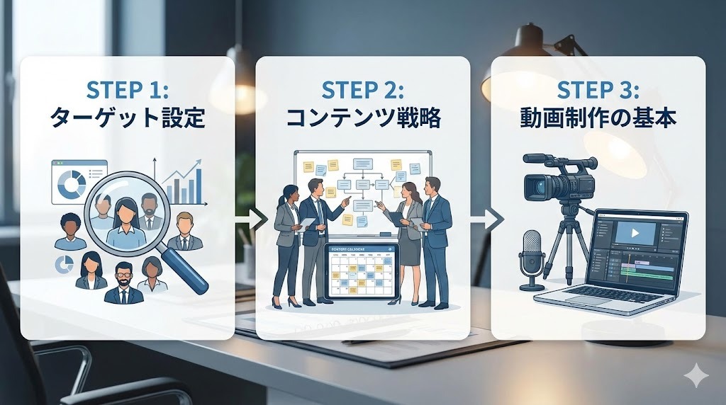 やみくもに動画を投稿し続けても、期待する集客効果は得られません。ここでは、ターゲットの明確化からコンテンツ戦略の立案、実際の動画制作に至るまで、失敗を防ぐために踏むべき具体的なステップを順を追って解説します。
