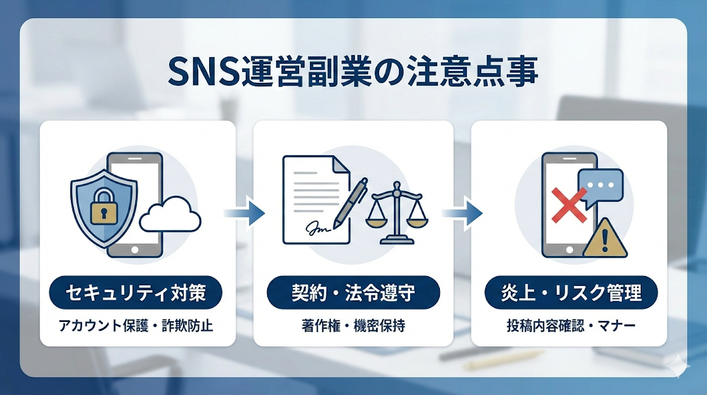 SNS運用を安全に続けるためには、トラブルを未然に防ぐための知識が必要です。以下の注意点を必ず確認してください。