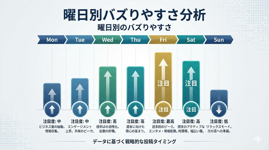 一般的に、週の半ばである火曜日や木曜日はバズりやすいと言われています。これらの曜日は、ユーザーが新しいコンテンツや娯楽を積極的に探す傾向があるからです。特に午後から夜にかけての時間帯は、活発な視聴行動が見られます。また、金曜日の夜や土曜日は、週末の開放感からエンタメ系コンテンツの需要が高まります。