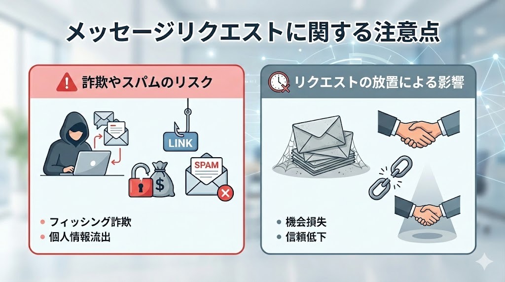 メッセージリクエストは便利な機能ですが、使い方を誤るとトラブルに巻き込まれるリスクもあります。安全に利用するために気をつけるべきポイントと、放置によるデメリットを解説します。