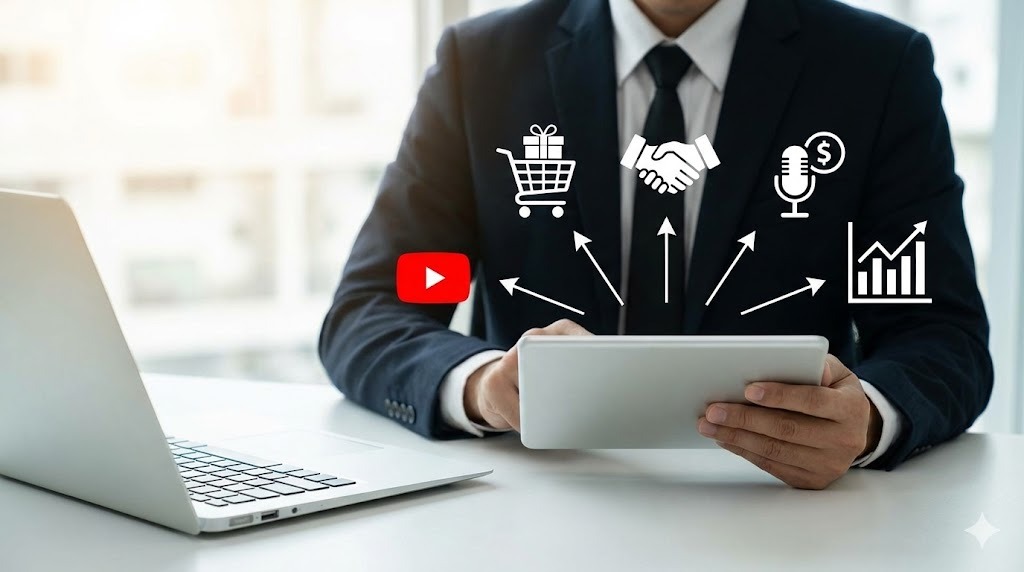 オリジナルグッズの販売や、オンラインコースの提供、自社サービスの紹介などが挙げられます。動画を「商品を知ってもらうための集客ツール」として活用し、外部での売り上げを目指す手法です。