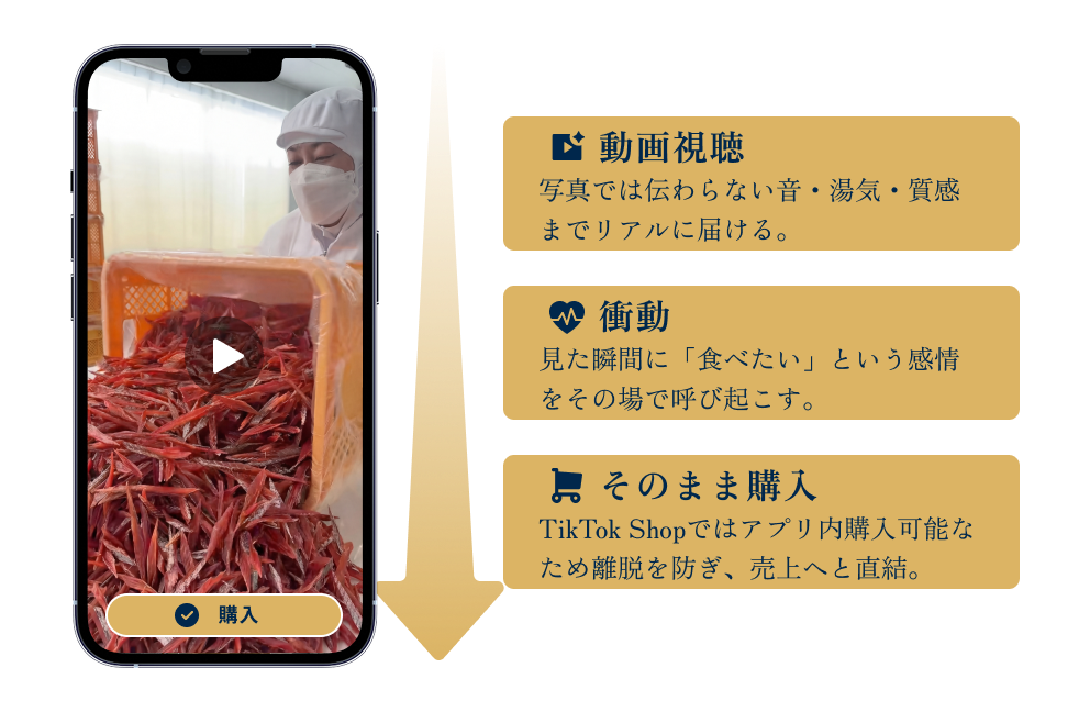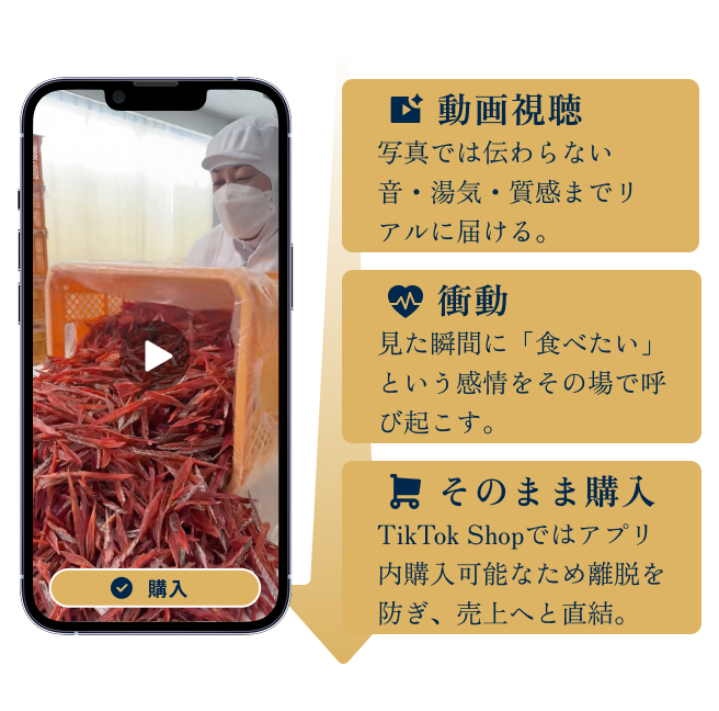 特にTikTok Shopは、動画を見て「欲しい」と思った瞬間に、アプリ内でそのまま購入まで完結できる唯一の場所です。